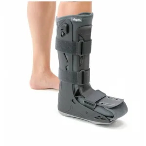 Νάρθηκας Κνημοποδικός “GO FIT 17” κατασκευασμένος από σταθερό υλικό πολυπροπυλένιο. Διαθέτει προσθαφαιρούμενη και αυτοκόλλητη αφρώδη επένδυση foam, η οποία καλύπτει εσωτερικά όλη την επιφάνεια της ποδοκνημικής. Είναι υποαλλεργική και αντιεφιδρωτική. Πρόσθια επιφάνεια ανατομικά σχεδιασμένη από πολυπροπυλένιο για μέγιστη σταθερότητα. Τρεις αυτοκόλλητοι ιμάντες περίδεσης. Σόλα με ανατομικό σχεδιασμό “ROCKER BOTTOM” για την απορρόφηση των κραδασμών. Διαθέτει δύο συστήματα (αριστερά – δεξιά) εισαγωγής-εξαγωγής αέρα για μείωση και αποθεραπεία οιδήματος – αιμάρθρου. Με το μεγάλο μαύρο μπουτόν εισάγεται ο αέρας ενώ με το μικρό μαύρο εξάγεται. Το αφρώδες μαξιλάρι χρησιμοποιείται προαιρετικά στην περιοχή του αχίλλειου τένοντα για καλύτερη εφαρμογή. Ύψος νάρθηκα 45cm.